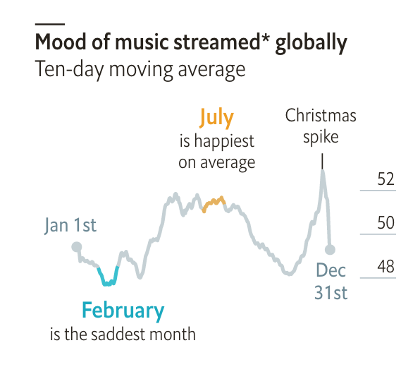 The Economist, (Février 2020). https://www.economist.com/graphic-detail/2020/02/08/data-from-spotify-suggest-that-listeners-are-gloomiest-in-february